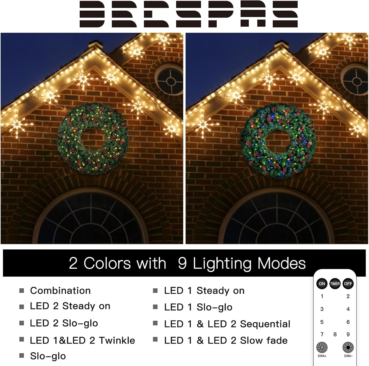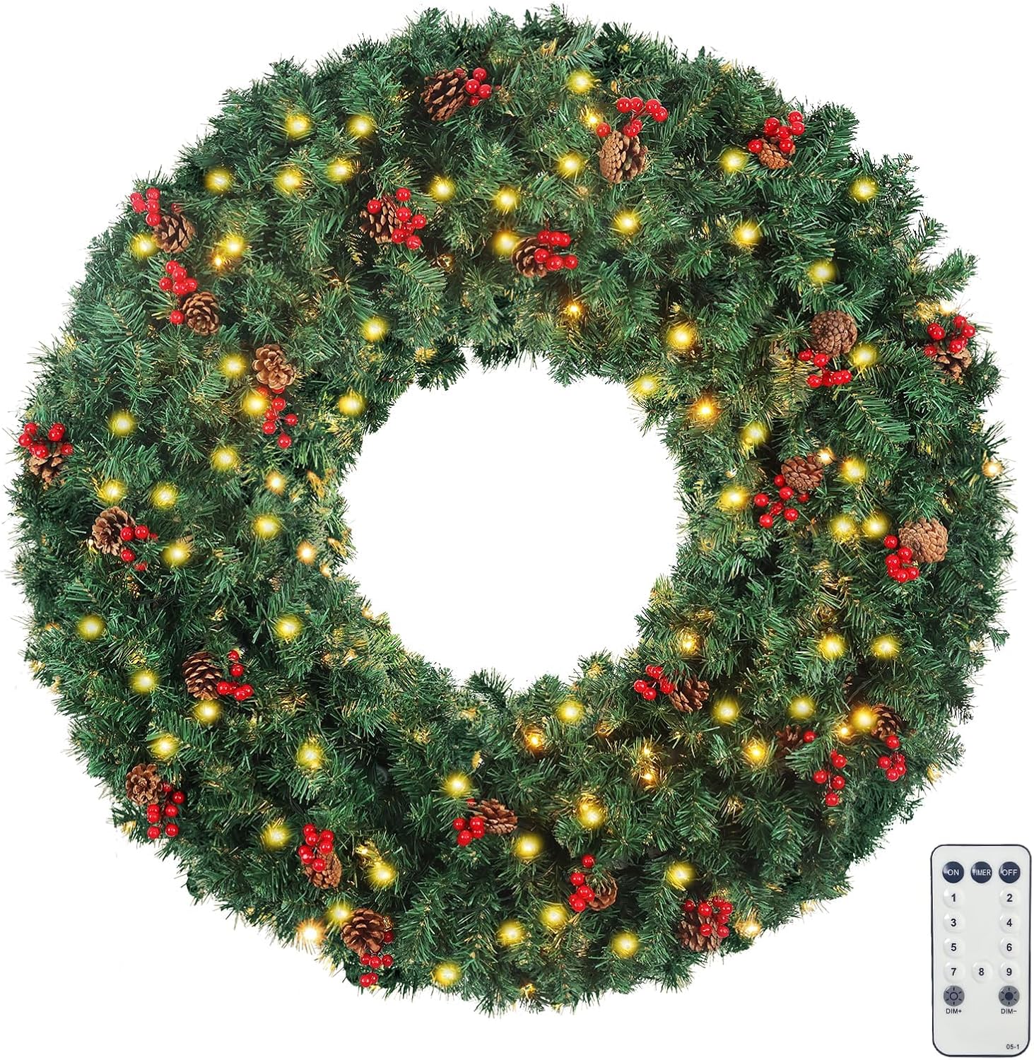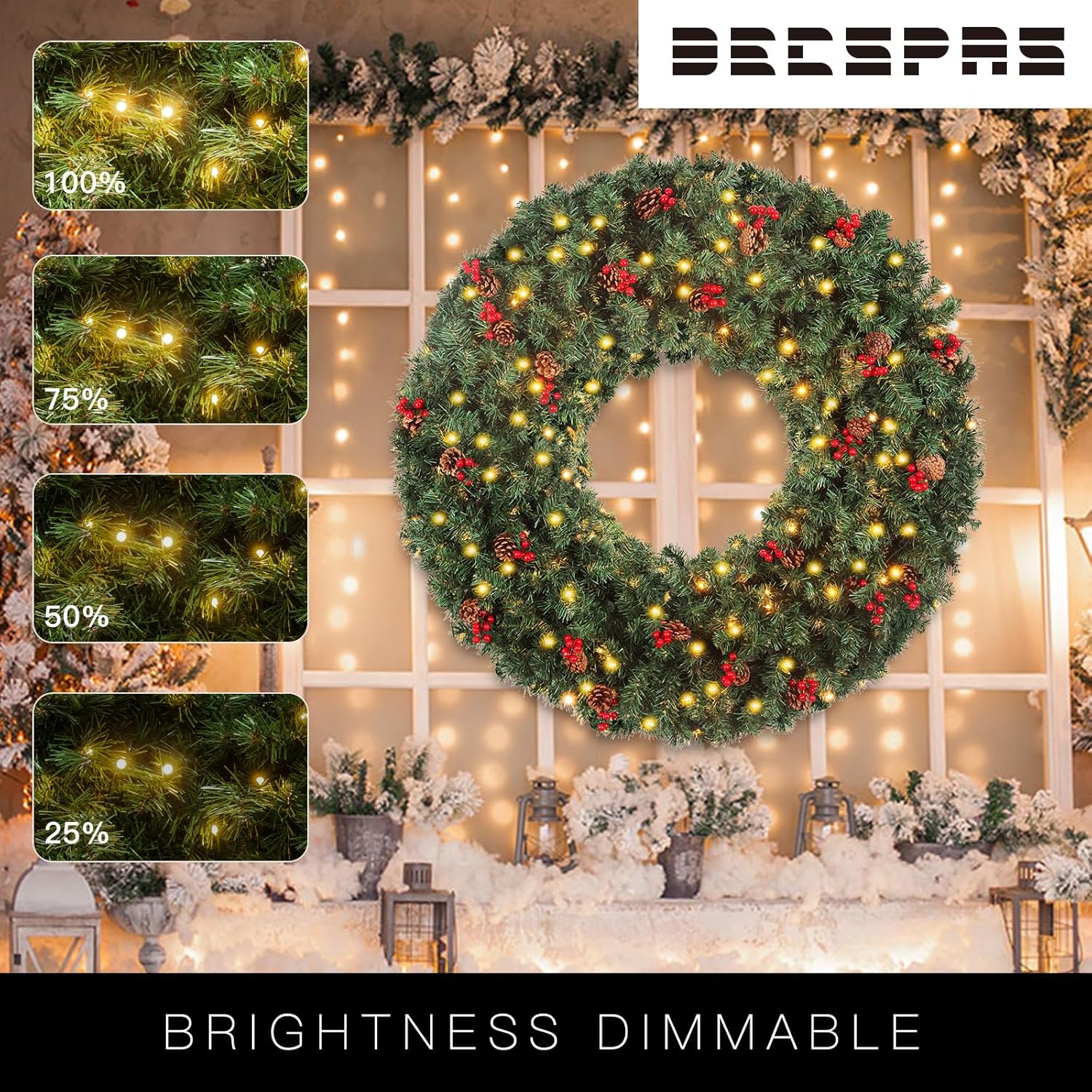 - ☃ 48" Christmas Decorations - DECSPAS Extra large christmas wreath with berries and cones uses premium artificial PVC branches and real pine cones, just as vivid as it just came out of the forest. Come with 220 lights in 2 colors an essential decor for celebrating Christmas. Bring the Chirstmas atmosphere by adorning your home with this 48-inch artificial wreath.