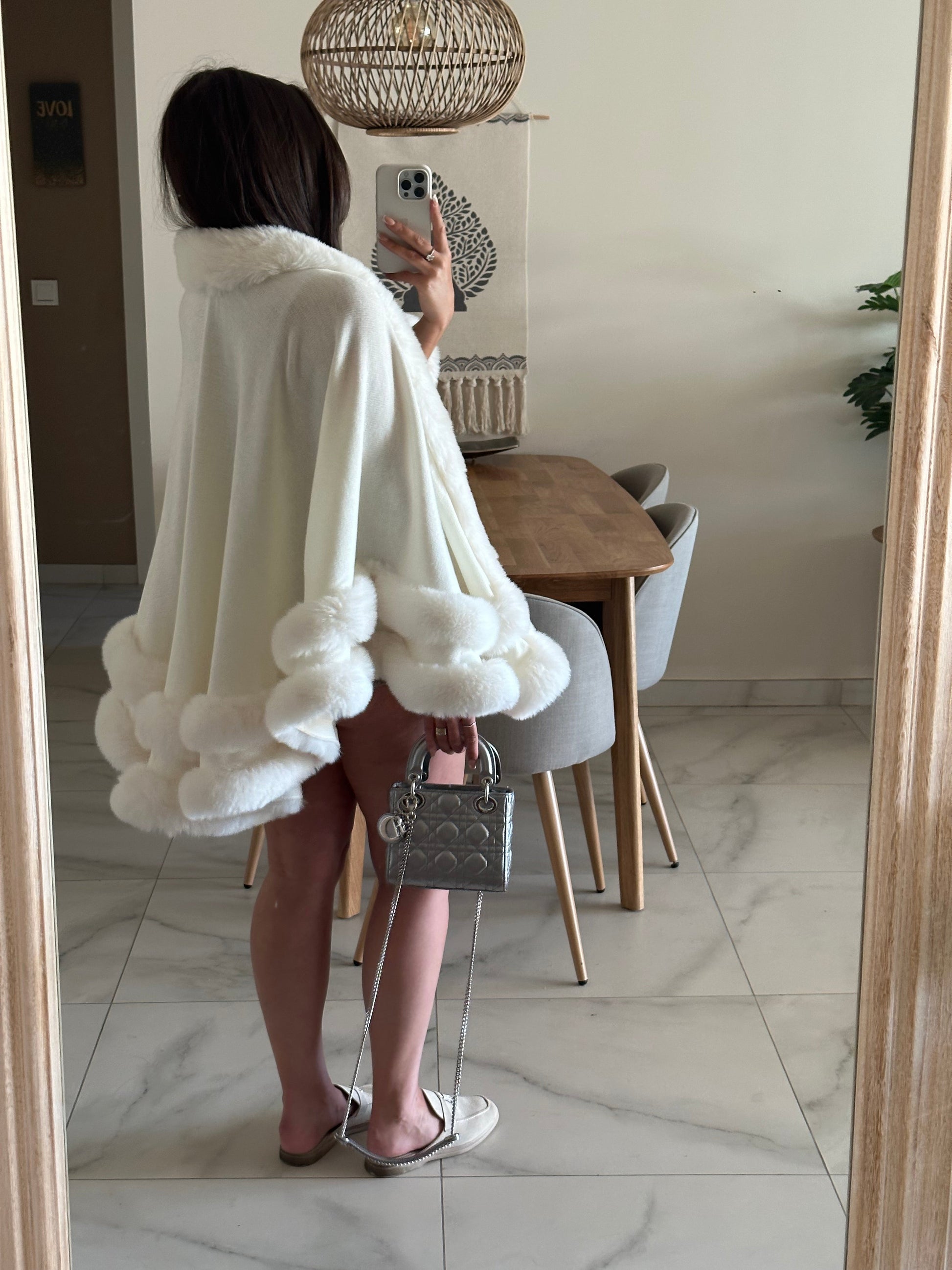The classiest must have style this autumn/winter. Luxurious faux fur trim on a batwing style cape available in this gorgeous cream white shade. Hook and eyelit on the front for fastening